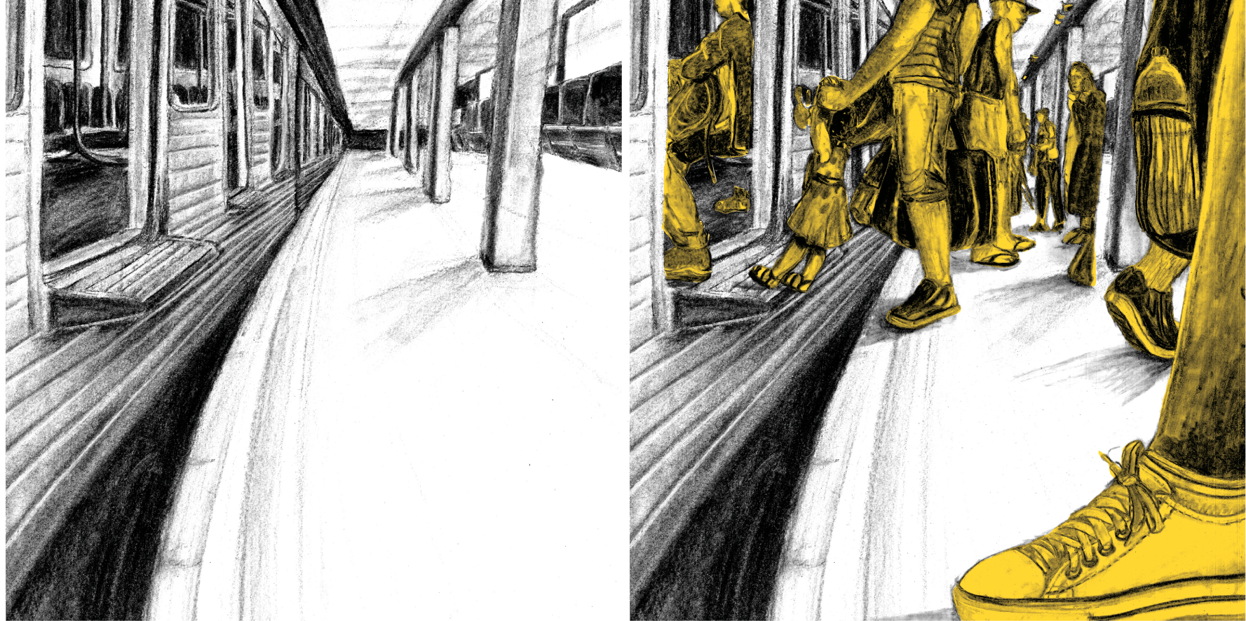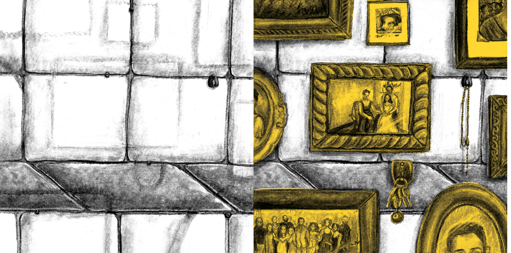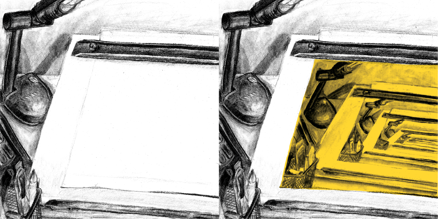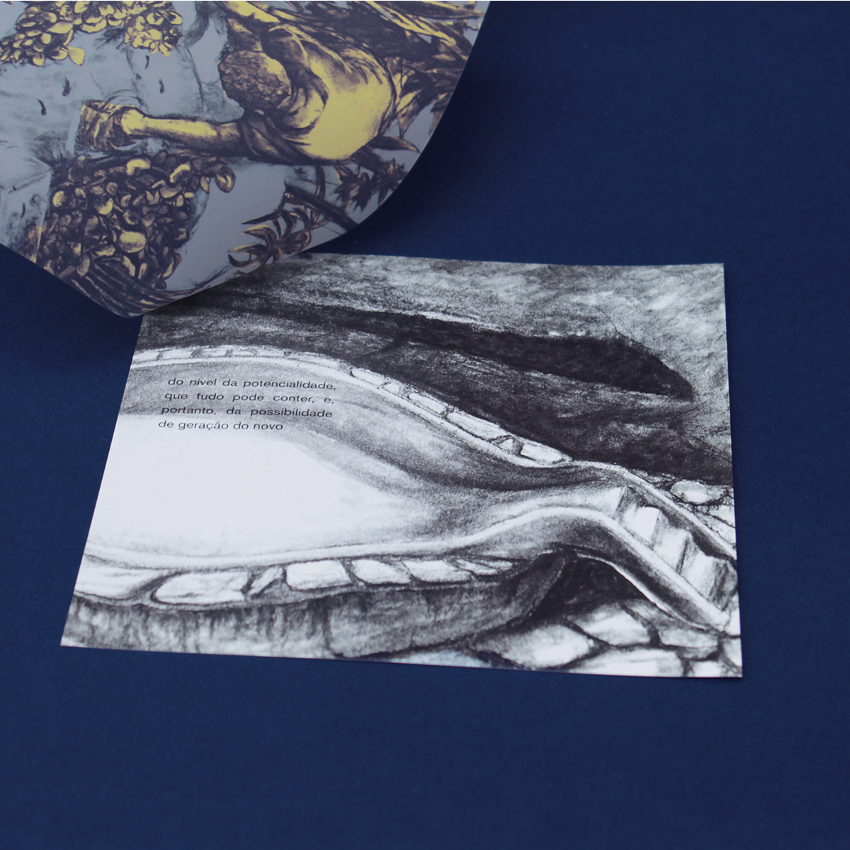 Assim, todas as artes foram produzidas com dois momento de leitura: O cheio, onde há a sobreposição de uma presença [uma pessoa, um objeto, etc.] em um cenário, e o vazio, gerado quando o leitor retira este “cheio”, podendo observar apenas um cenário vazio. Essa retirada é possibilitada pela construção dos cartões ilustrados, onde os elementos da ilustração são impressos em papel vegetal, separados de seus cenários.