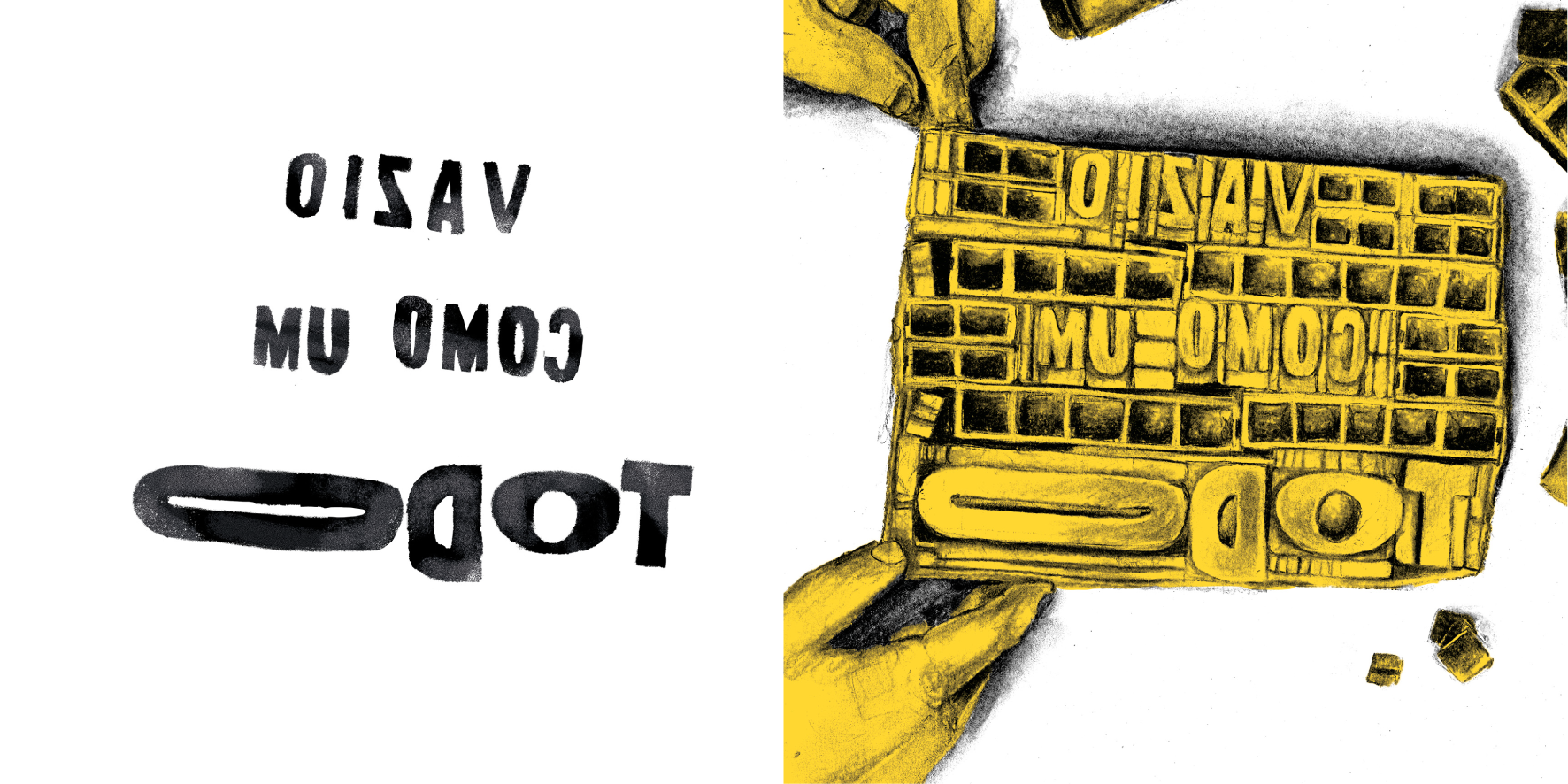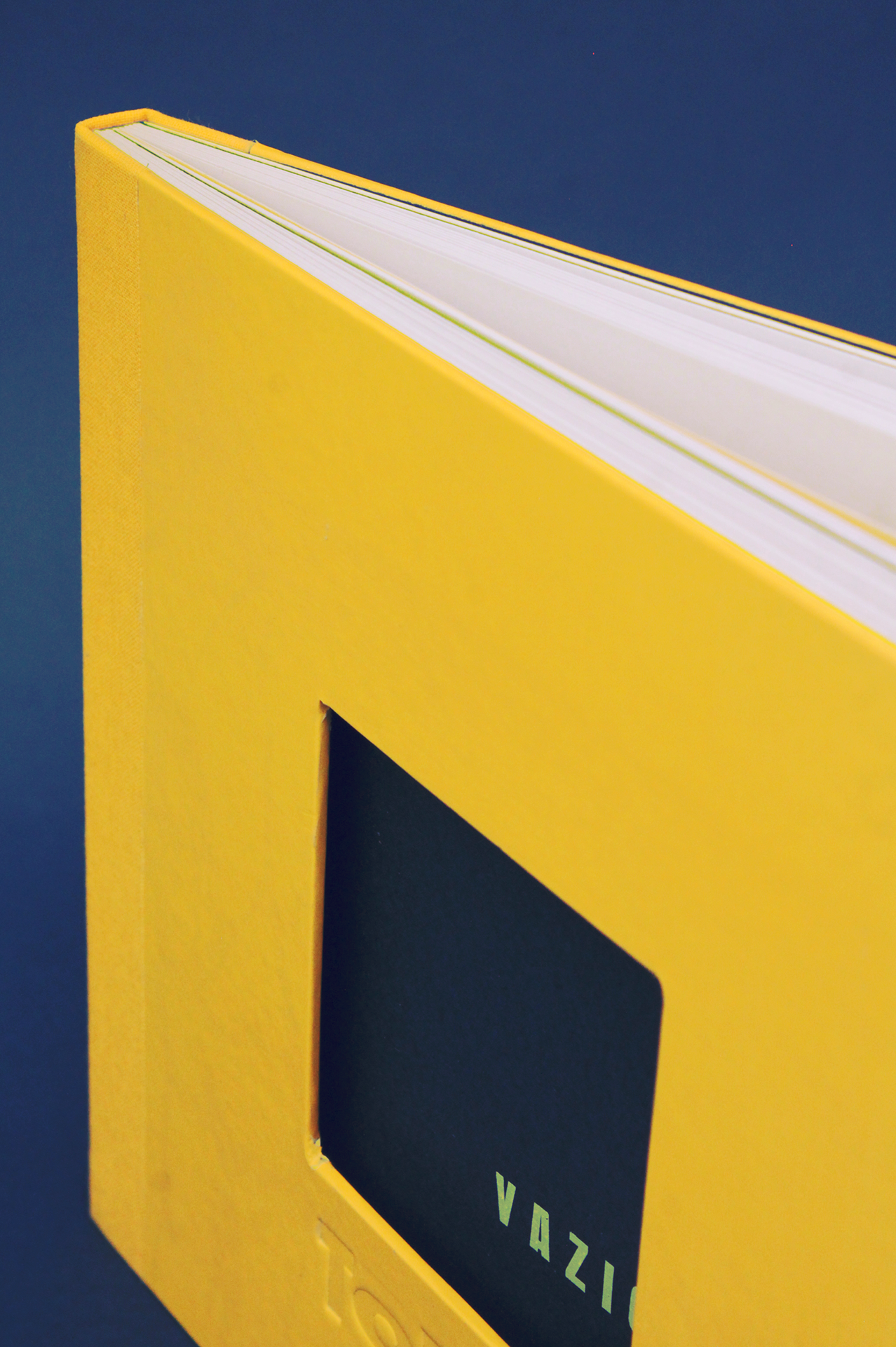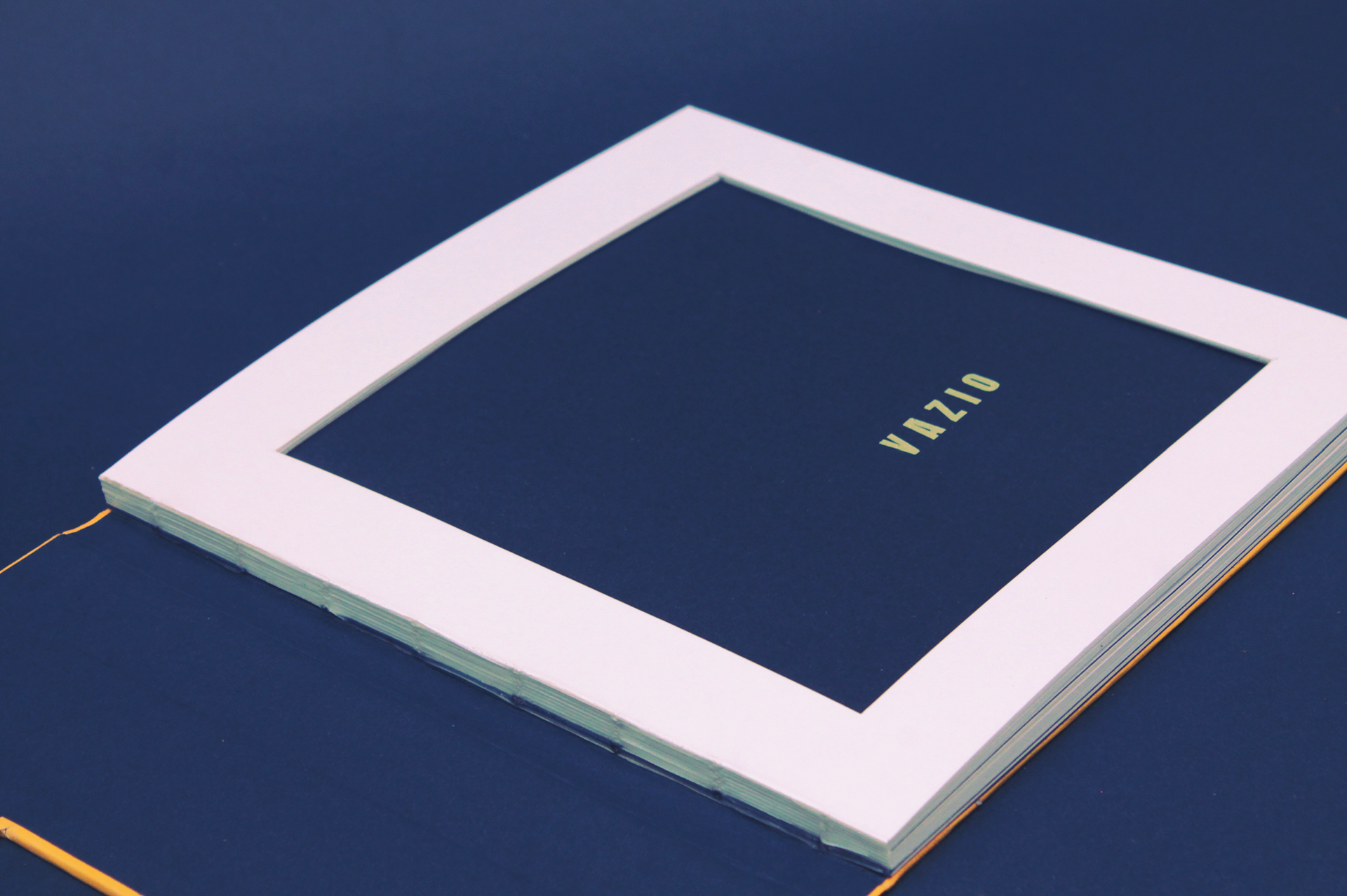 Uma das ideias fundamentais do projeto é que o ato de esvaziar fosse algo que guiasse a estrutura física da do livro. Com base nisso, projetamos um livro que possibilita que o leitor ativamente crie um livro vazio, por meio da retirada do conteúdo — as ilustrações. Isso é possível pela criação de um vão cortado dentro das páginas, no qual as ilustrações são apenas encaixadas, sem serem propriamente fixadas, permitindo que o leitor as retire e reordene livremente.