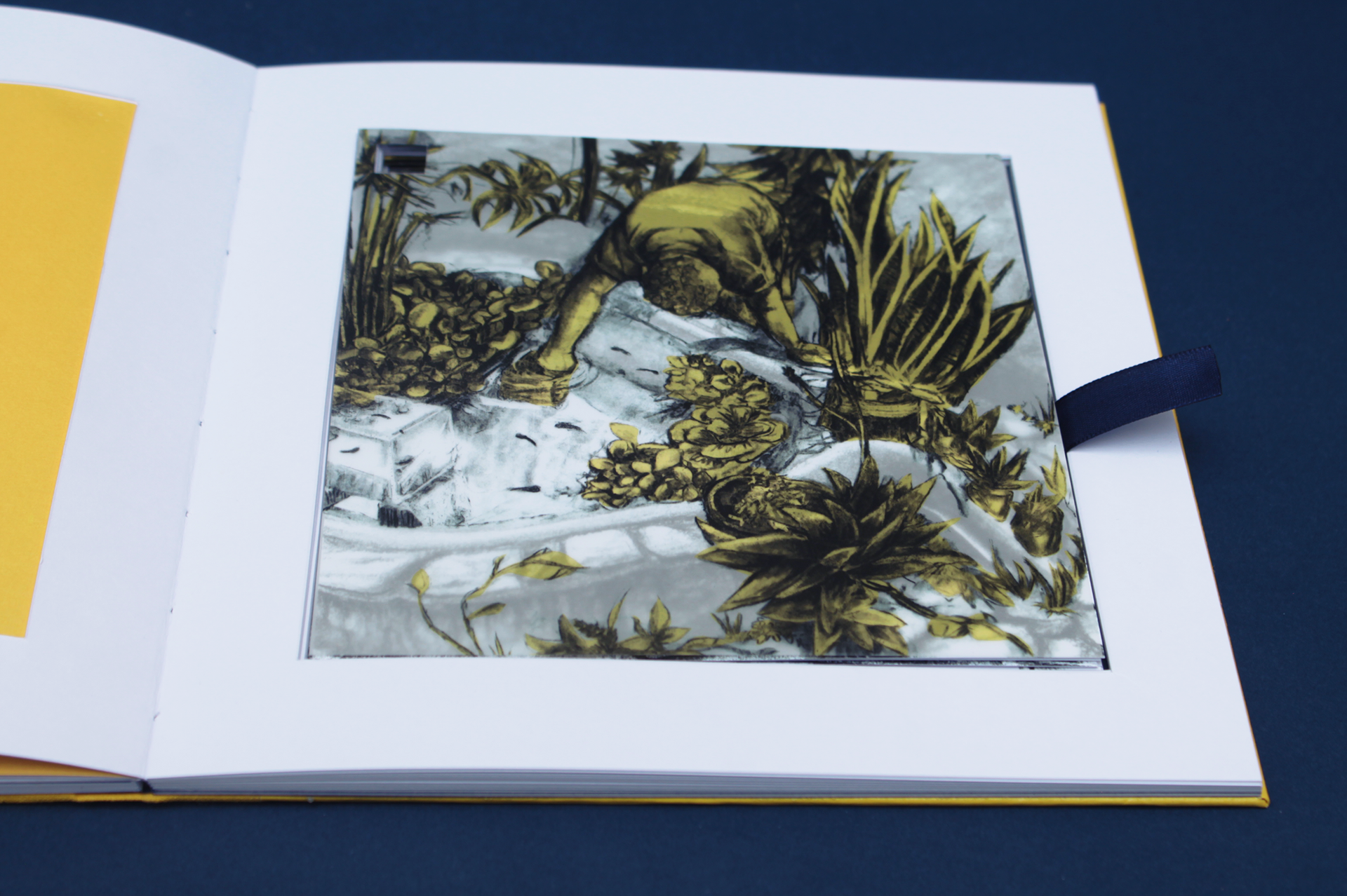 O livro possui formato 20 cm por 20 cm, capa dura revestida em papel Couché 180g/m2 com aplicação de laminação fosca, verniz UV localizado e gravação em baixo relevo por chlichê, com uma janela de 8 x 8 cm centralizada.