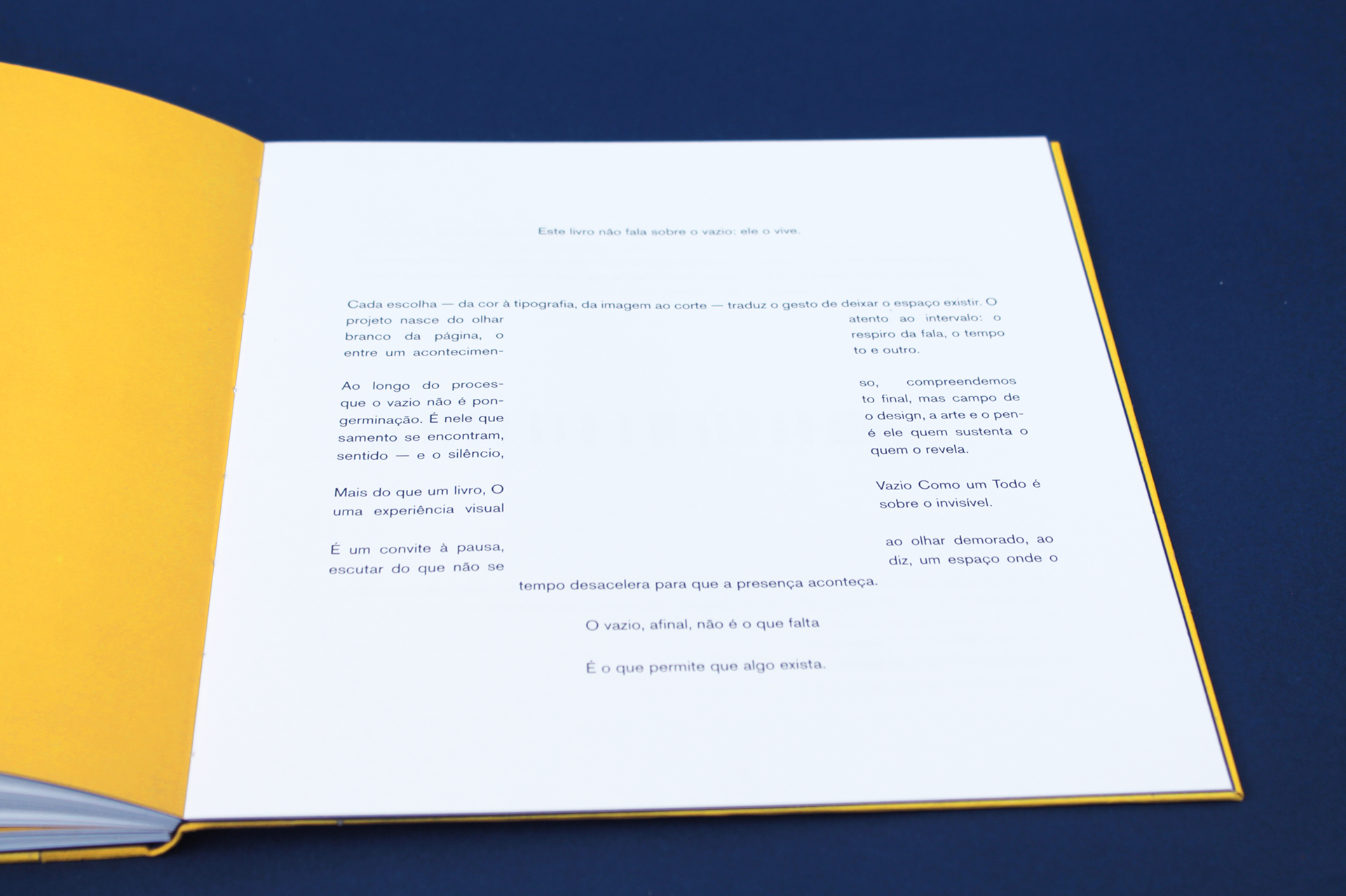 Elaborado como meu Trabalho de Conclusão de Curso da minha graduação em Design Gráfico pela Universidade Estadual de Minas Gerais, em dupla com Laura Matos, Vazio como um Todo é um projeto que busca retratar o vazio sob a ótica da percepção humana. A partir de diversas experimentações, foi obtido este editorial, composto por uma parte escrita e 14 cartões ilustrados interativos, elaborados com base em excertos interdisciplinares que abrangem de textos filosóficos e linguísticos à poesia e música.